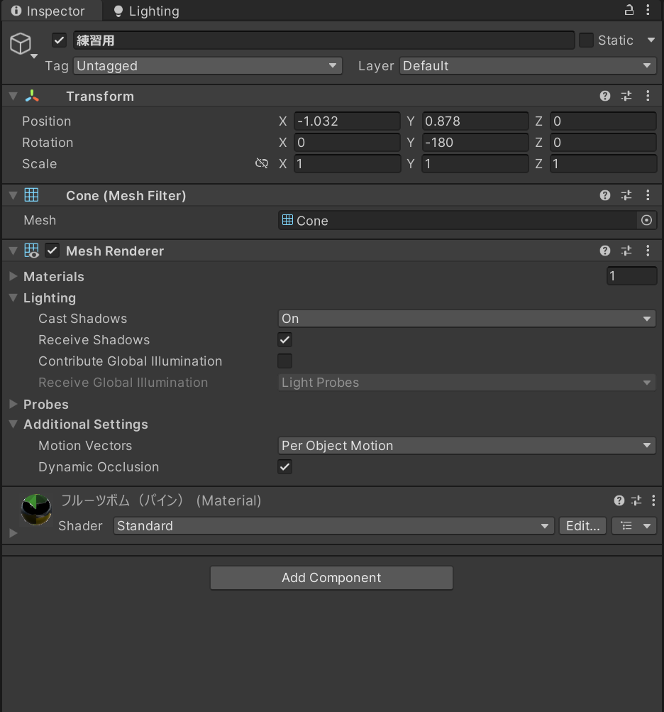 - 対象のオブジェクトを選択して、「Inspector」の一番下にある「Add Component」(図2)を押す。