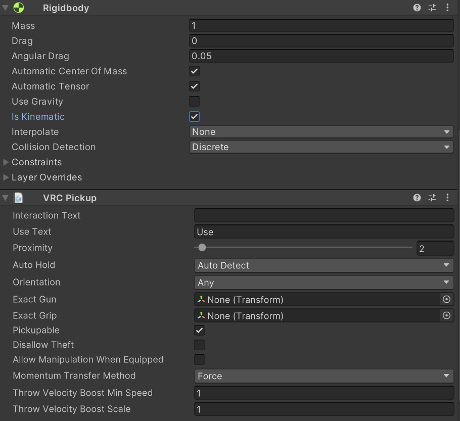 - 「VRC Pickup」内の「Pickupable」チェックを入れる。(持てるようにする)[必要]