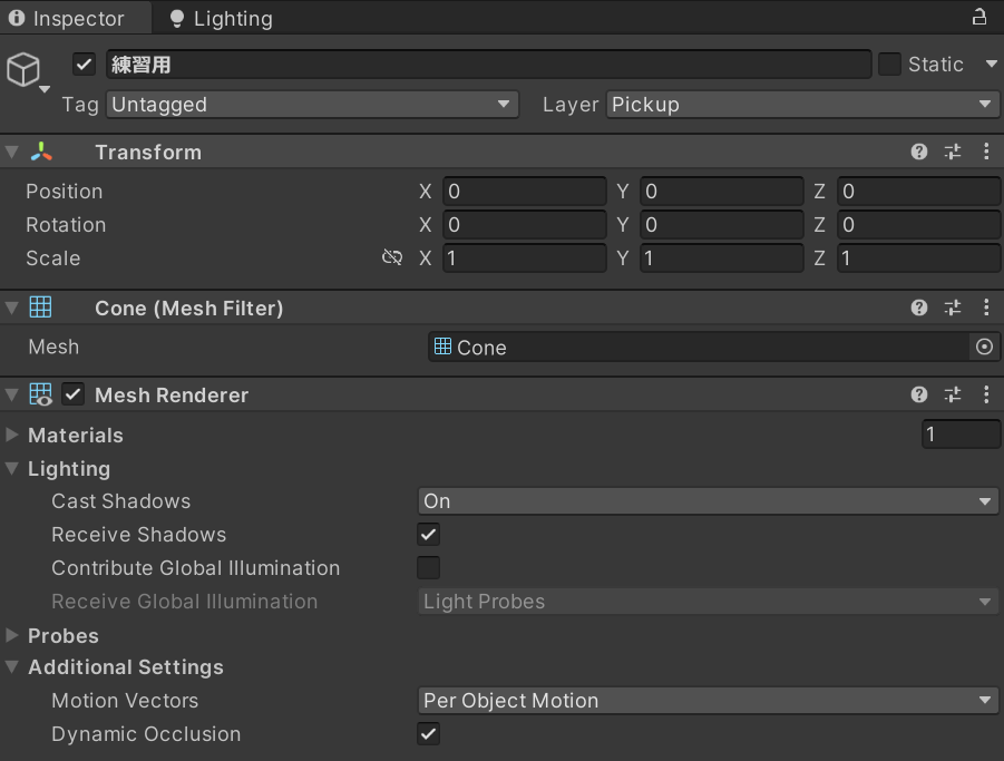 - 「Rigid Body」内の「Is Kinematic」チェックを入れる。(空中で静止する)[変更可]