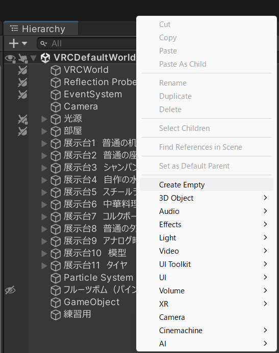- 「Hierarchy」内に「Create Empty」で「空のオブジェクト」を作る(図7)。