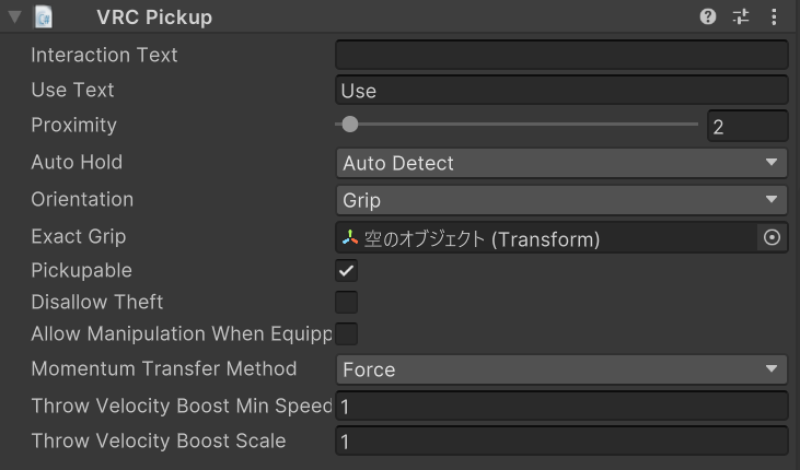 - 「VRC Pickup」内の「Exact Grip」で先程追加した「空のオブジェクト」を選択する(図8)。
