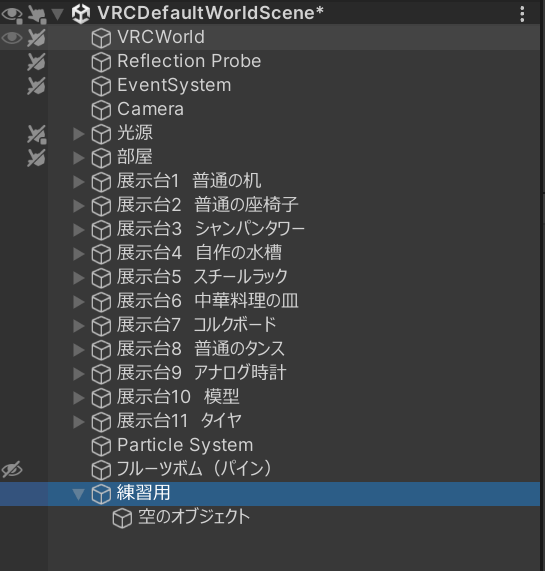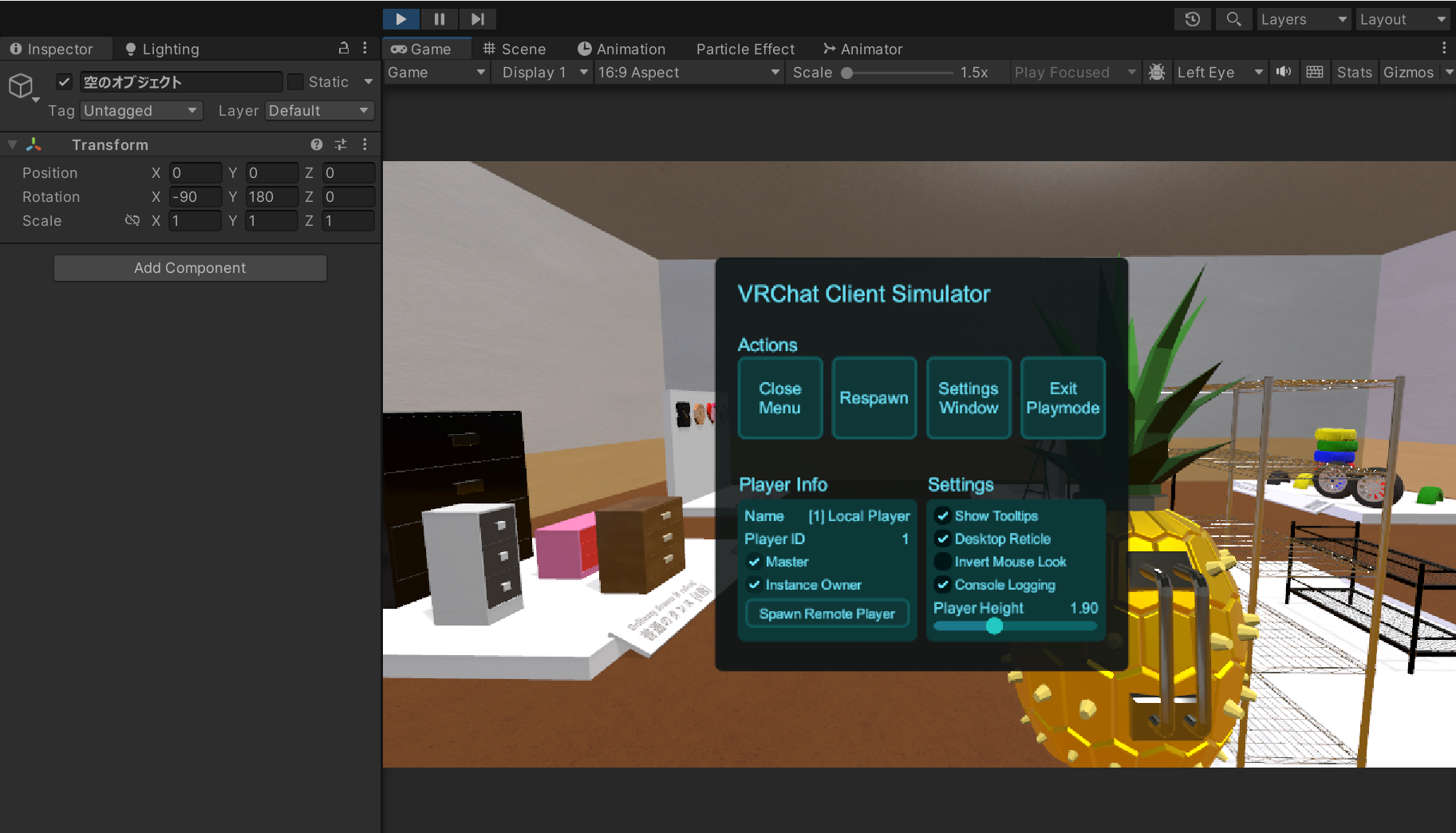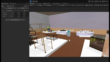 持つオブジェクトと空のオブジェクトの位置を合わせておかないと、「持つ」→「離す」を繰り返した時にどんどん手元からずれていくので、「Transform」をリセットしています。2つのオブジェクトを親子関係にした後に親オブジェクトを動かせば問題なく好きな場所に配置できます。